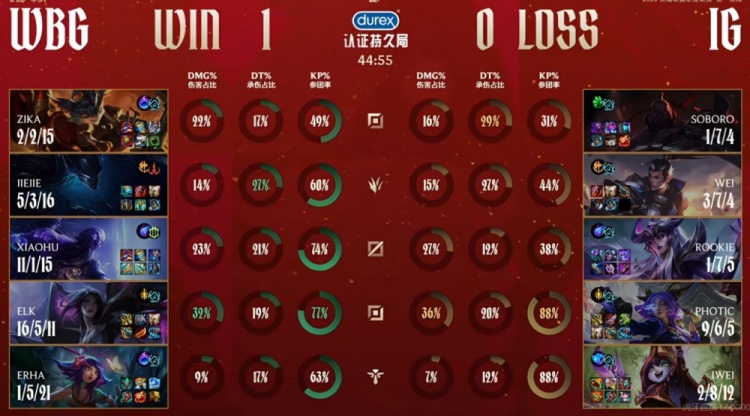 首局比赛Xiaohu瑞兹河道团双杀,Jiejie梦魇和Zika兰博也包下成功!WBG仅仅10分钟就拿下3K经济优势,随后中期推塔拉开经济差!但iG连续拿下三条小龙成了伏笔!中期WBG连拿两条大龙,先破对手中路高地,一度拿下快一万六的经济差!但是WBG核心位手短,不敢推高地,中路依靠Zika兰博大招先手之后打出0换3想一波的时候但是没兵线了!WBG想强行一波结束,但是站在基地后的Photic芸阿娜三杀,iG击杀WBG四人反而拿下了第三条大龙!