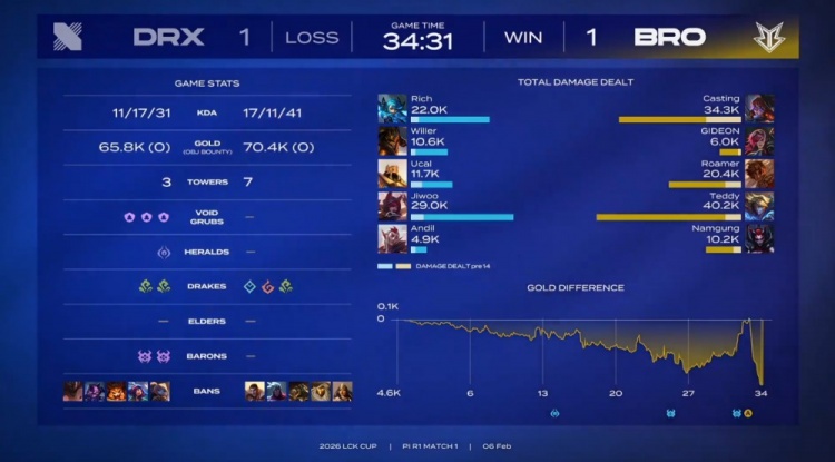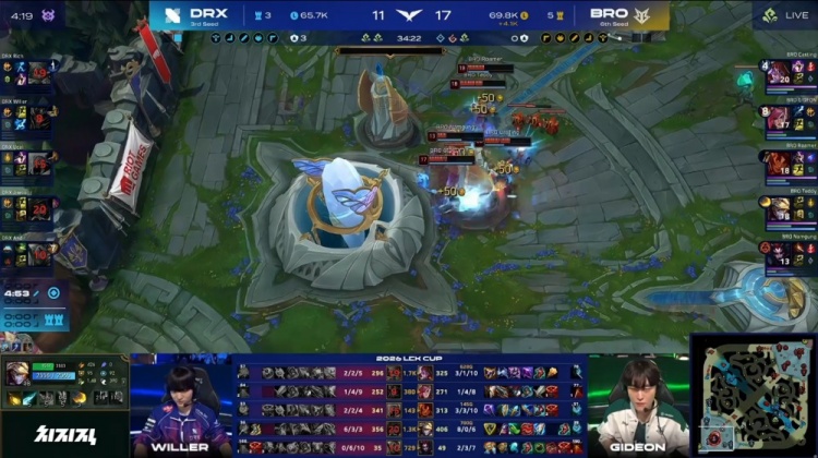 中期BRO听牌炼金龙魂,中路团战Jiwoo霞先拿双杀,teddy带领上辅反打最终2换3。此后大龙团,Wiiler皇子中路绕后火锅扣住BRO双C,DRX打出1换2吃掉大龙,扳平前期经济劣势。