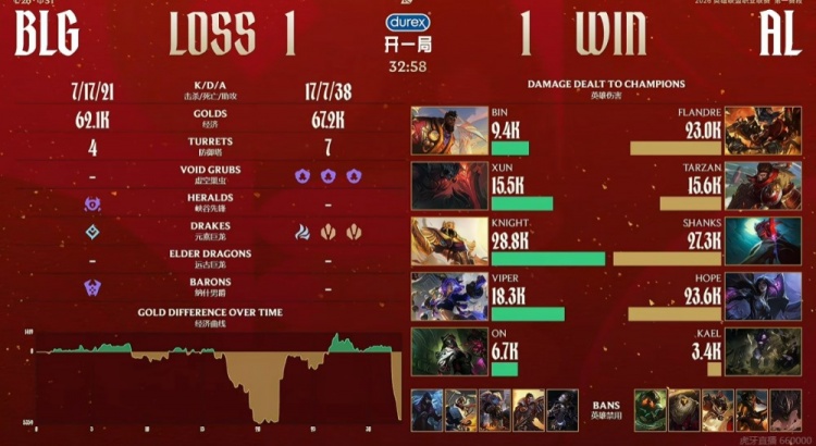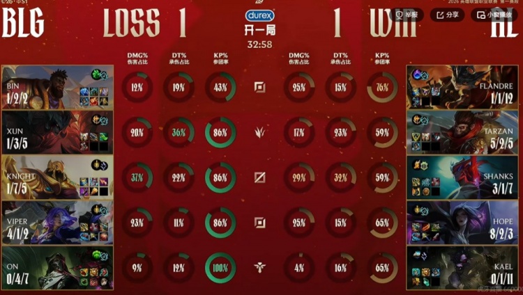 【32:07】BLG开打大龙,双方拉扯中knight沙皇闪现推被多个闪现规避,反而自己吃到兰博大招丝血被迫开出金身!kael牛头找到机会Q闪顶把Viper芸阿娜顶到人群里切死!BLG双C倒下没输出了啊!最终Hope卡莎三杀收尾,AL一波团灭BLG,从上路推平基地,扳平比分!