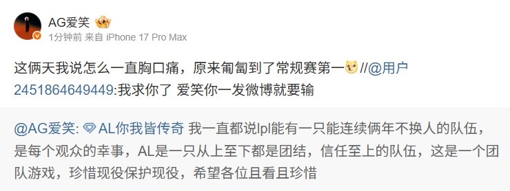直播吧2月6日讯 LPL第一赛段AL战胜BLG,赛后AL经理爱笑发文: