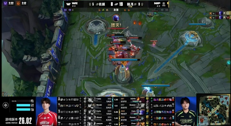 【14:01】WE三人在对手野区强动Care瑞兹,结果被他相位跑掉+Guwon安蓓萨大招拉扯,Assum烬华彩配合队友反打,Care瑞兹开车断后,NIP前后包夹打出0换3!不过随后Care瑞兹换到上路没闪被逮捕,双方互换边路一塔,WE拿下先锋!