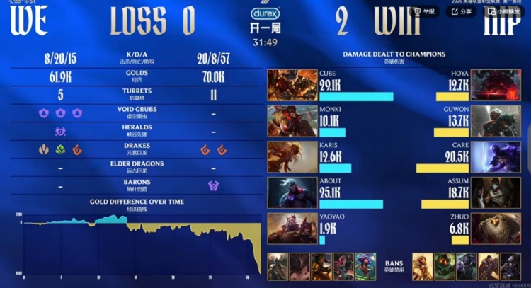 第二局前期双方发育,但是WE依靠对线优势拿下3小龙+巢虫+先锋的优势!但是中期WE先是对手野区追击过深被打出0换3,随后Cube兰博中路团战TP落地吃到瑞兹禁锢白给!HOYA奥恩大招配合队友追击打出1换3,NIP成功拿下大龙+第四条小龙,断了WE的龙魂节奏!随后二大龙团前yaoyao洛开团失败,WE四人集合结果又被HOYA奥恩大招击飞四个!这波Care瑞兹双杀,NIP打出1换3又拿二大龙+第五条小龙!最终上路团Guwon安蓓萨大招找到Karis岩雀,NIP团灭WE结束比赛,拿下坚毅组最终的头名!