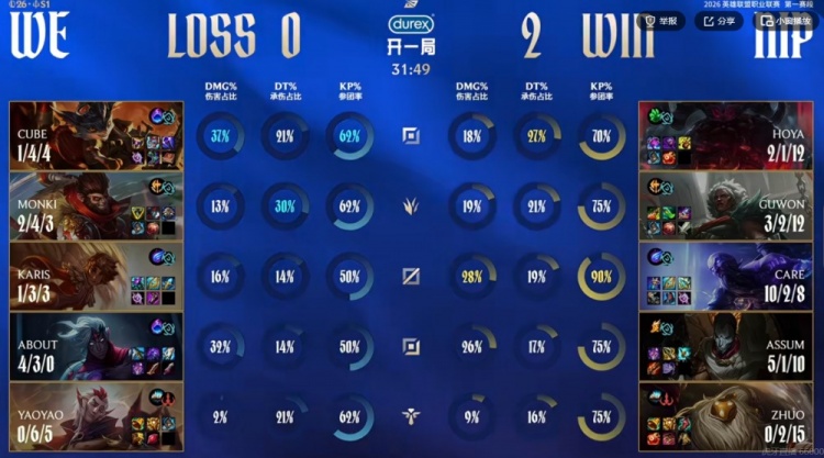 WE:上单Cube、打野Monki、中单Karis、下路About、辅助yaoyao