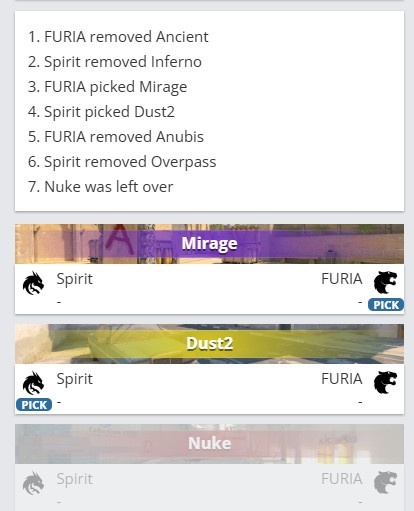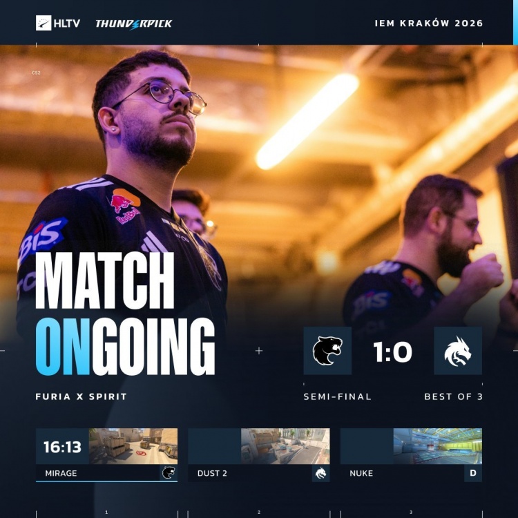 下半场sh1ro手枪局双杀+赢下1v2残局,然而随后molodoy开始不断收割帮助Furia反超比分,不过Spirit这边donk英雄AK双杀+tN1R三杀残局艰难挽救两个赛点拖入加时!加时赛中黑色闪光在A1被包夹的情况下大狙三杀力挽狂澜,最终FalleN大狙三杀收尾,Furia以16-13险胜先拿选图!