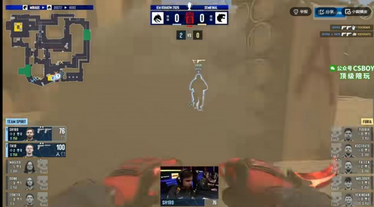 第一局Spirit一波爆弹进攻B区,B小道走单的sh1ro双杀帮队伍打出人数优势!donk也卡超市位拿下双杀!6-7!