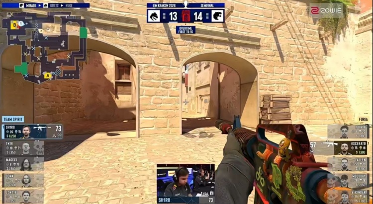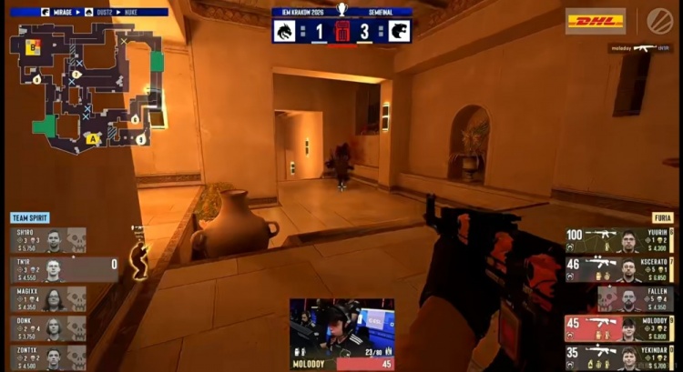 图一是Furia选择的Mirage!Spirit拿下手枪局之后直接被秒翻,随后FalleN联手molodoy双人ACE拿分,Furia一度拿到6-2领先。不过随后sh1ro大狙发威,donk连续三杀帮助Spirit半场追平比分。