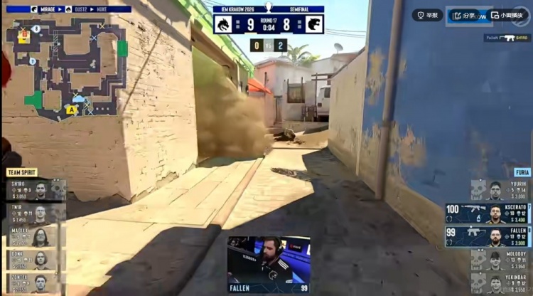 第五局Furia强起,Spirit经济也不是很好!Spirit进攻A区但是被双A二的Furia第一波打出2换3的人数优势!残局1V2,sh1ro转B区下包,被从B小回防的FalleN尾随击杀!8-9!