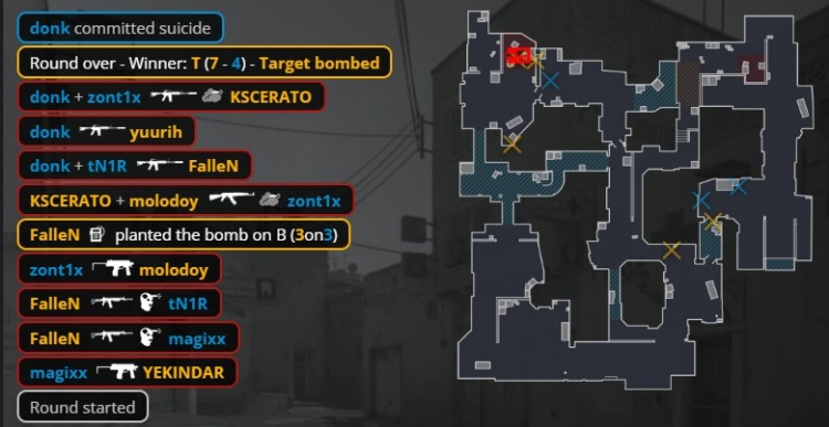 第11回合magixx在A大门换掉狂哥,教父双杀magixx与tN1R后带队转B下包,donk残局爆轰三杀但没时间拆包,C4爆炸,黑豹拿到第7分。