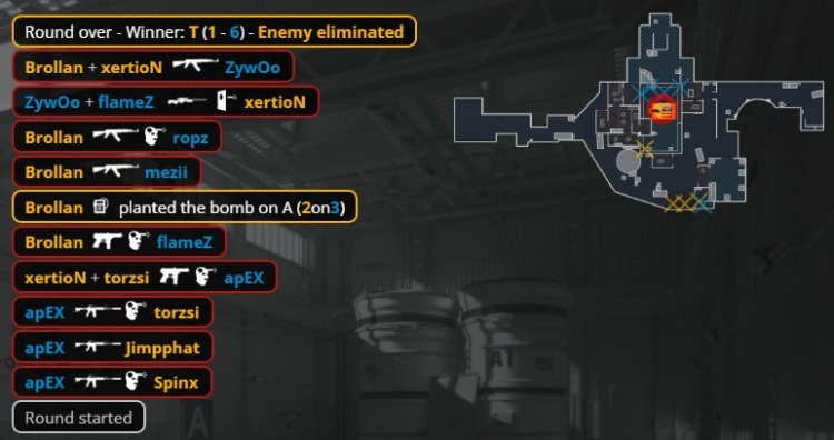 易边再战,外场对枪MOUZ先倒三人,小蜜蜂进A,ropz双杀拿到小蜜蜂第9分。次回合MOZU强起,torzsi鸟狙轰掉Zywoo,xertion外场法玛斯打掉apex,ropz打掉Brollan与火仔进A下包,xertion回防双杀单局三杀后拆包拿到第5分。次回合小蜜蜂纯E让出第6分。