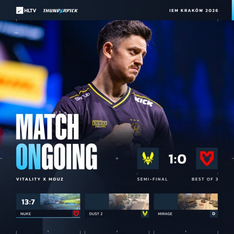 直播吧2月8日讯 CS2大赛IEM克拉科夫半决赛,MOUZ对阵老对手Vitality!