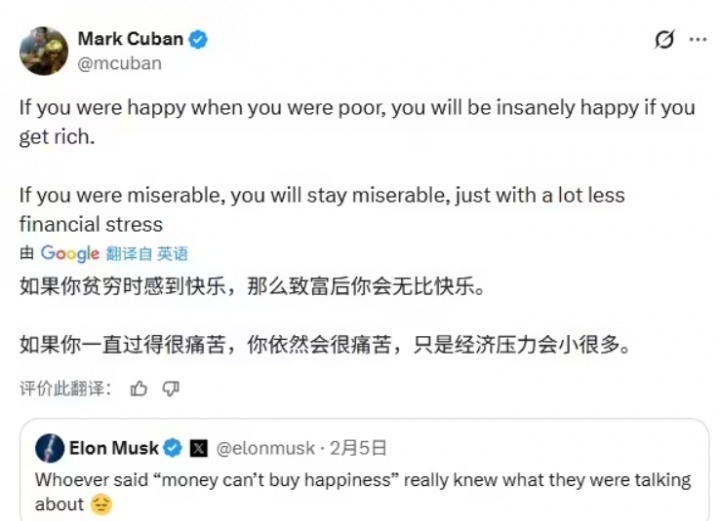 马克 · 库班回复,财富与幸福之间的联系并不是“非黑即白”的。本质上,金钱并不会决定是否幸福,更多的只是放大已有的幸福感。