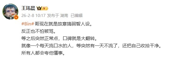Bin哥现在就是故意搞弱智人设。