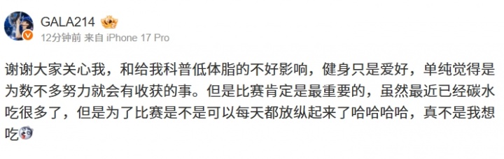 但也有不少声音指出,为了健身的状态维持低碳摄入,会影响比赛状态,对此今日GALA更博回应。