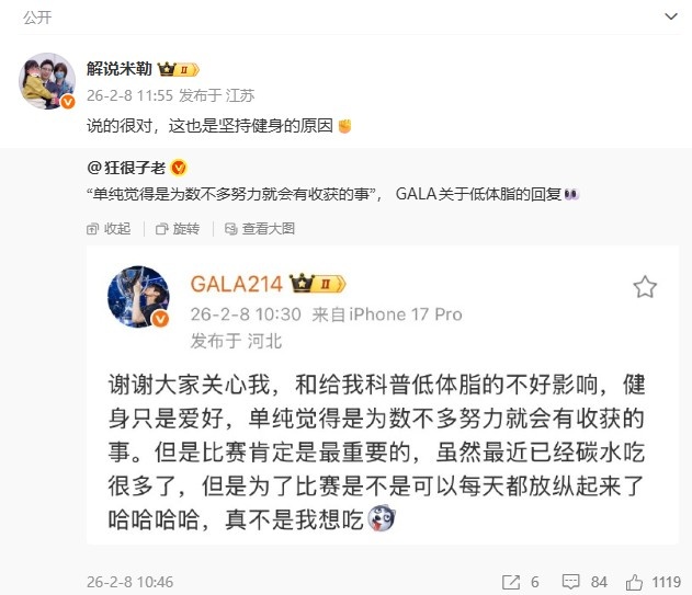 >解说米勒看GALA解释健身:说的很对,这也是坚持健身的原因✊