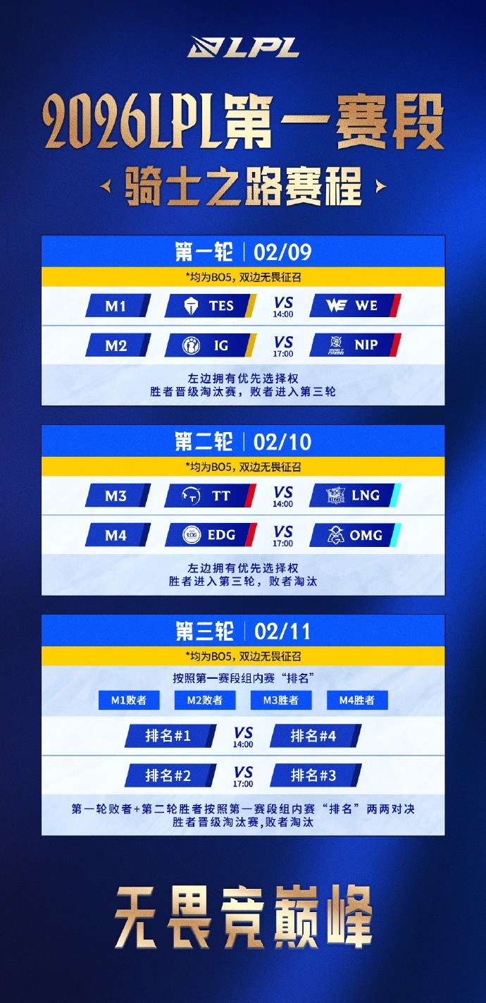 2026LPL第一赛段骑士之路将于2月9日开赛!本阶段分为三轮比赛,第一轮比赛由TES对战WE、IG对战NIP,其中登峰组两支队伍拥有优先选择权,双方进行双边无畏征召模式比赛(Bo5),胜者晋级淘汰赛,败者进入第三轮;