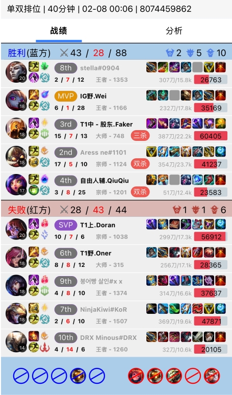 直播吧2月8日讯 根据韩服排位统计小程序显示,今日凌晨Wei韩服排位排到Faker,Wei使用波比,Faker使用沙皇。