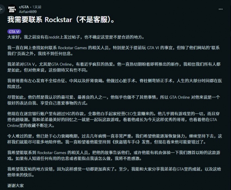 直播吧2月8日讯 近日,Reddit论坛上一名网友发文称,希望能联系到Rockstar Games(R星)官方人员,让身患重病的弟弟有机会在正式发售前体验《GTA6》。