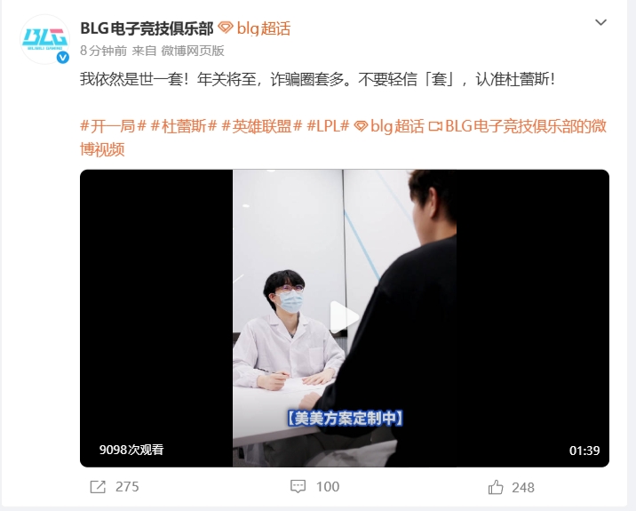 直播吧02月08日讯 BLG官方微博账号更新了一段与避孕套品牌杜蕾斯的合作广告,视频中Viper、Bin等选手出镜👇