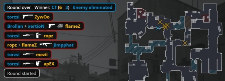 第9回合torzsi大狙A小轰掉apex后,中路双杀mezii与ropz后手枪打到Zywoo,torzsi单局四杀终于帮助MOUZ拿到第3分。