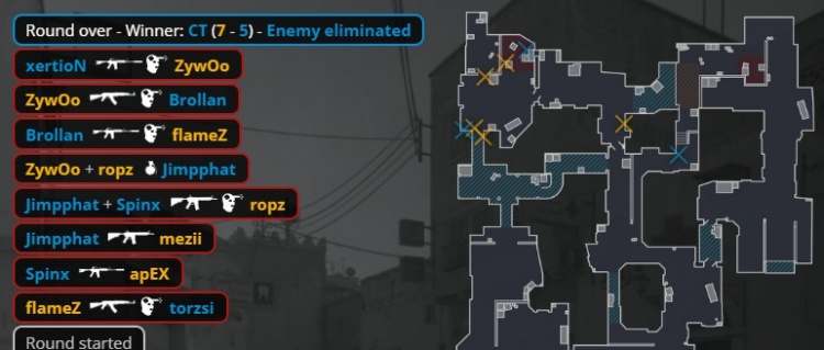 半场结束前最后一回合,Spinx与小吉米双人看B三杀,Zywoo三分球炸飞小吉米后,火仔假下包,xertion与Brollan双拉狗洞将其打掉,Zywoo残局1v2被xertion打掉,MOUZ以5-7结束上半场。