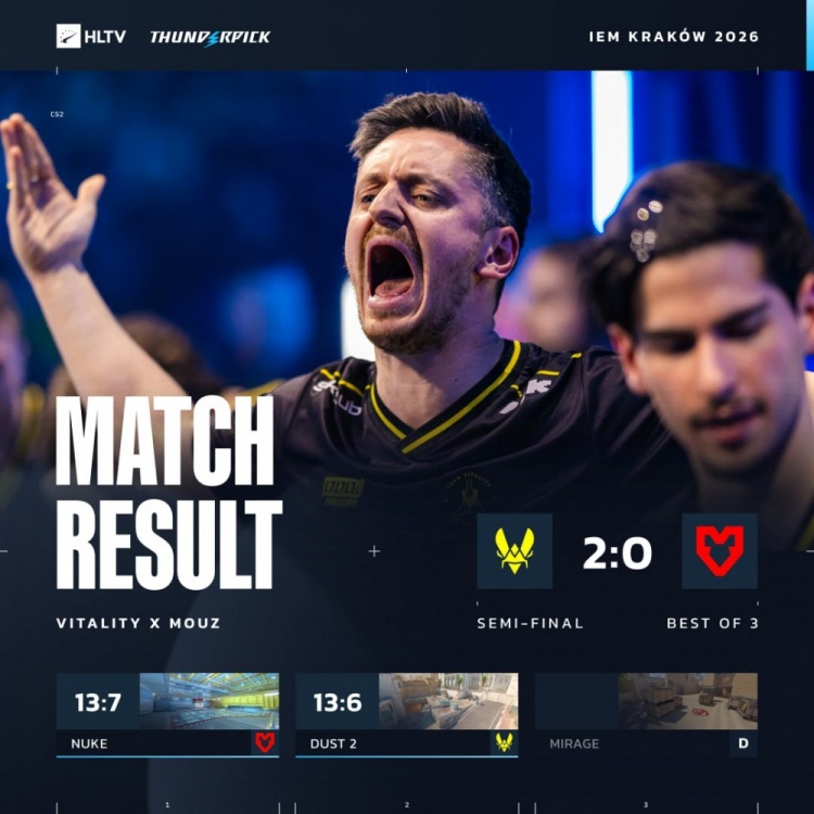 直播吧2月8日讯 CS2大赛IEM克拉科夫半决赛,Vitality横扫老对手MOUZ,挺进决赛对阵黑豹!MOUZ将进入季军赛与Spirit争夺季军!