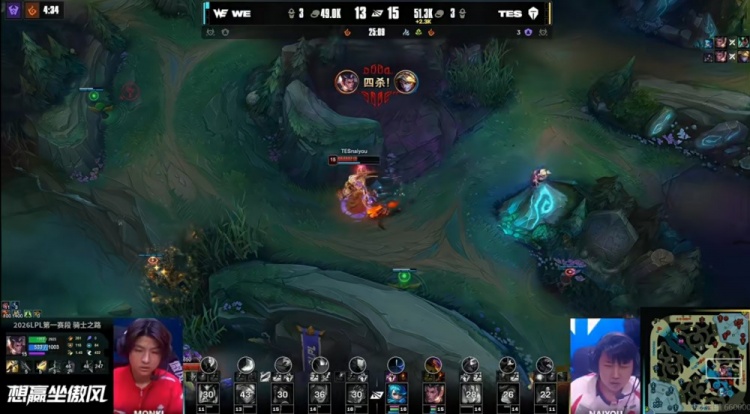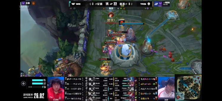 【24:42】小龙团,JiaQi女枪拿下小龙,Cube鳄鱼绕后进场和JiaQi女枪互换,残局Fengyue牛头用命顶走了About伊泽瑞尔没让他连续输出!naiyou赵信非常能打,配合369格温留住阿卡丽之后自己还黏住了对手下路组!最终naiyou赵信四杀,这波TES团灭WE,双方经济差目前3K不到!