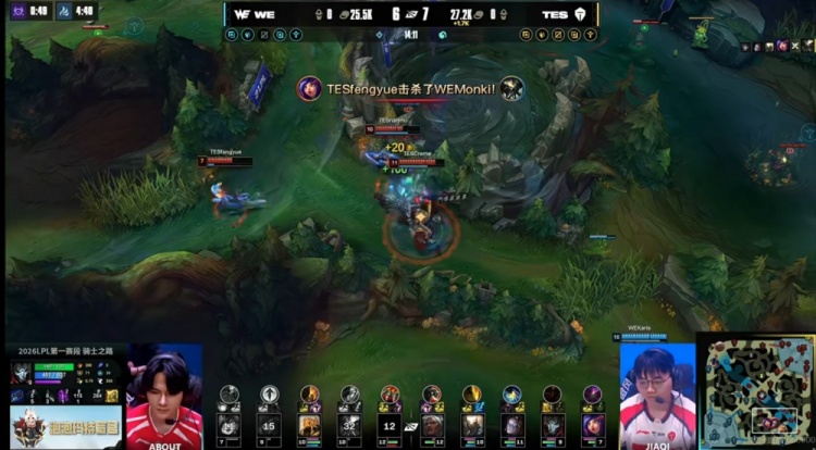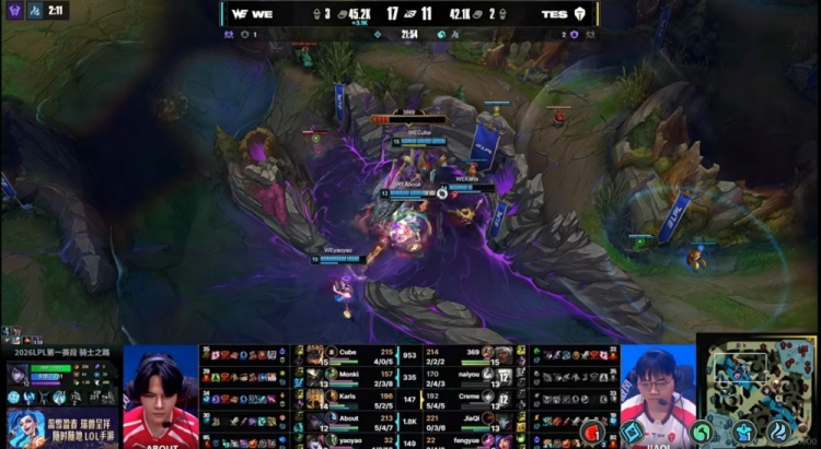 【21:25】中路Karis沙皇先手出击推回naiyou潘森,TES四人在位还想反打,结果WE双C实在很能打啊!残局About厄斐琉斯关键清辉夜凝命中俩残血,将TES中野全部带走!WE回头拿下大龙!4K经济优势了!