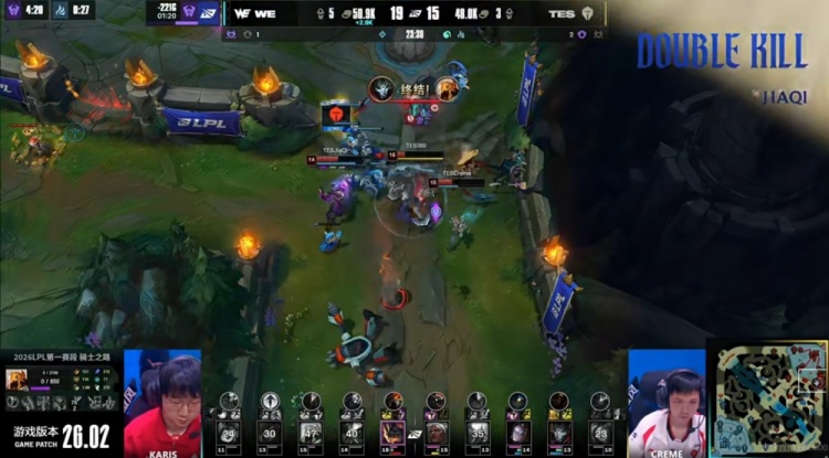 【23:30】WE强拆下路高地,但是被绕后的Fengyue妮蔻带球进场闪现坐大了五个啊!Creme发条大招拉满AOE!哪怕是WE装备领先但是369安蓓萨也大招进场了!残局JiaQi烬在高地没人管补充输出,TES一波2换5团灭WE!又抹平了前面的经济差!TES顺势还拿到了风龙听牌!