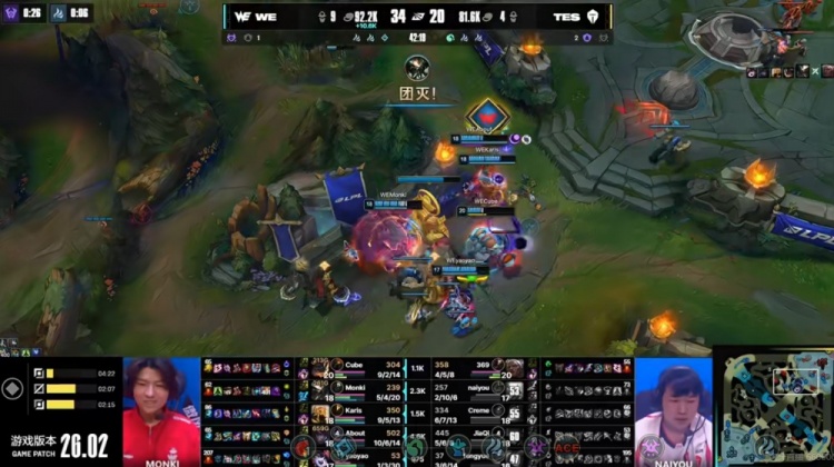 【19:02】TES拿下小龙之后Fengyue妮蔻大招强开四个,但是队友跟不上!Monki斯卡纳反手钳住两个配合上了Cube兰博大招!Karis沙皇进场推回三个让Cube兰博可以贴脸火烤拿下双杀!这波虽然About厄斐琉斯再度倒下,但正面又是WE的1换3!WE领先2K了!