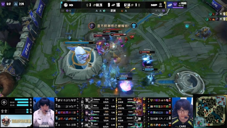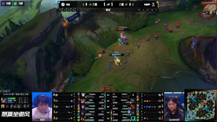 中期Rookie妖狐连续上路与下路支援联手Soboro贾克斯击逮捕HOYA纳尔,先锋团Guwon蒙多龙坑游龙双杀,NIP打出2换4拿到先锋,经济优势2k。
