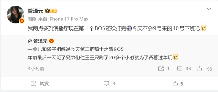 >管泽元:我2点到演播厅第一个BO5都没打完 不会9号来的10号下班吧