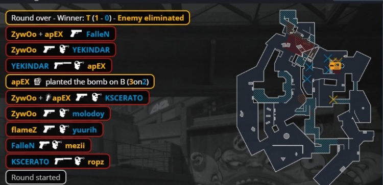 第14回合小蜜蜂强起,mezii看短管换掉狂哥,Zywoo吹风机再杀卡神,教父打掉Zywoo后在B下包,yuurih守包架烟双杀apex与火仔,小蜜蜂6-8黑豹。