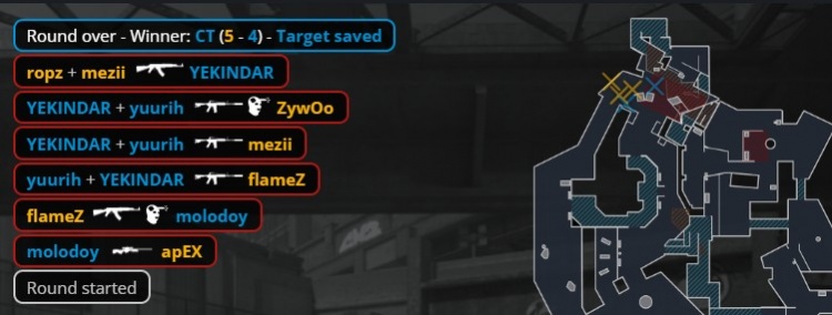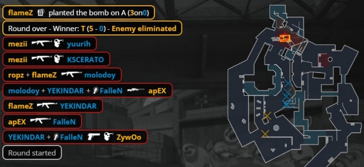 第4回合A大yuurih先杀Zywoo,教父工地同时杀掉mezii与ropz,apex冲进工地爆轰三杀后下包,再杀yuurih完成单局四杀,小蜜蜂4-0黑豹。