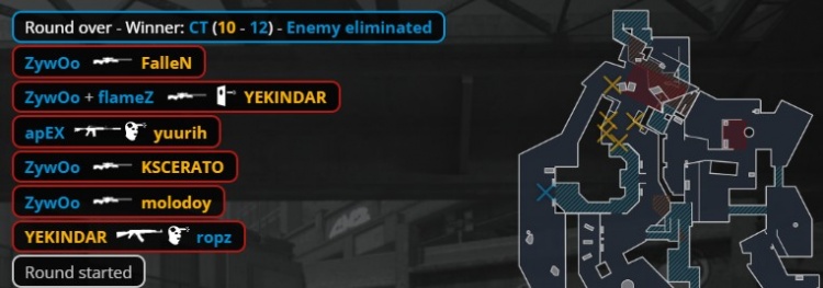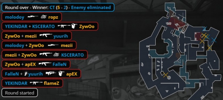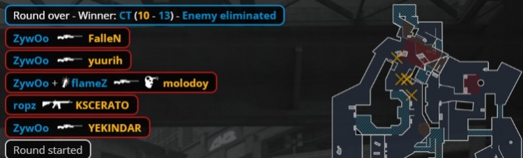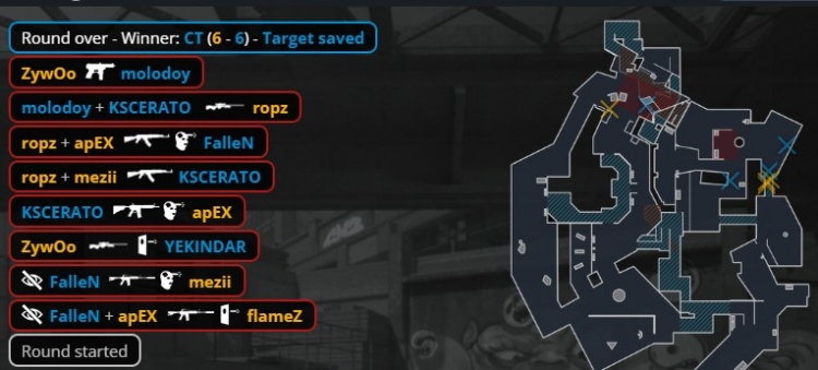 第12回合开场教父全白短管混烟双杀火仔与mezii,Zywoo大狙架工地打掉狂哥,ropz长管双杀卡神与教父,molodoy回B击杀ropz后被Zywoo用tec-9击杀,但时间耗尽,双方上半场6-6战平。