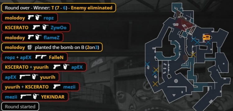 第6回合mezii前顶A大打掉molodoy,狂哥下水道上A打掉mezii,apex包点换掉狂哥,教父法玛斯打掉ropz,火仔再杀教父后下包再杀yuurih,卡神回防双杀火仔与Zywoo后拆包,小蜜蜂5-1黑豹。