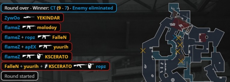 第9回合molodoy厕所大狙先杀游乐园滑梯apex,小蜜蜂四人转A,molodoy空枪被火仔击杀,狂哥与yuurih包点双人三杀,ropz打掉狂哥后保枪,小蜜蜂5-4黑豹。