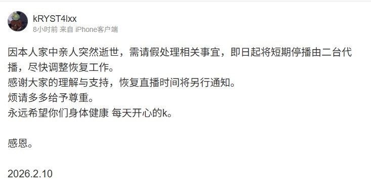 因本人家中亲人突然逝世,需请假处理相关事宜,即日起将短期停播由二台代播,尽快调整恢复工作。
