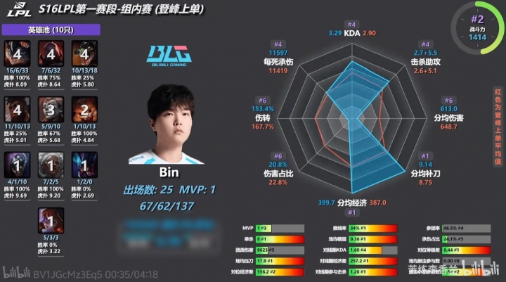 吸血鬼型上单😂Bin第一赛段数据雷达图:吃最多的经济打最少的伤害!