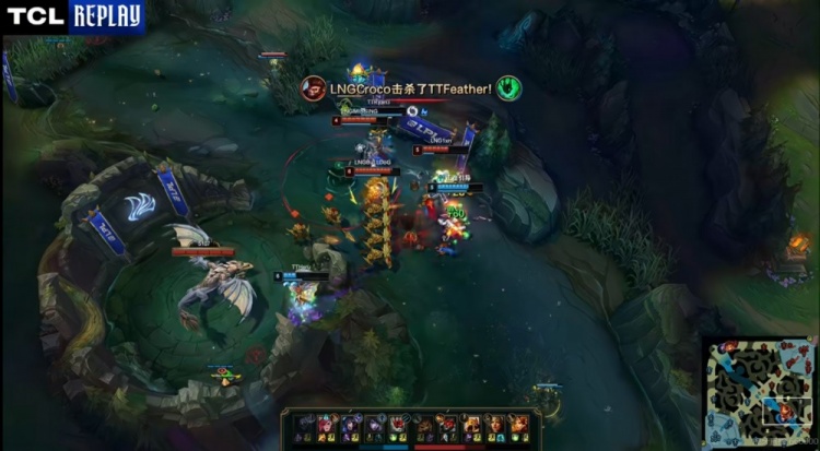 【42:24】LNG拆掉TT中下两路高地+双门牙塔,想一波!侧翼找输出位置的Ryan3厄斐琉斯被Croco猴子闪现开到,被秒了!没有厄斐琉斯TT守不住了!LNG终于可以结束本局,翻中翻拿下三个赛点!
