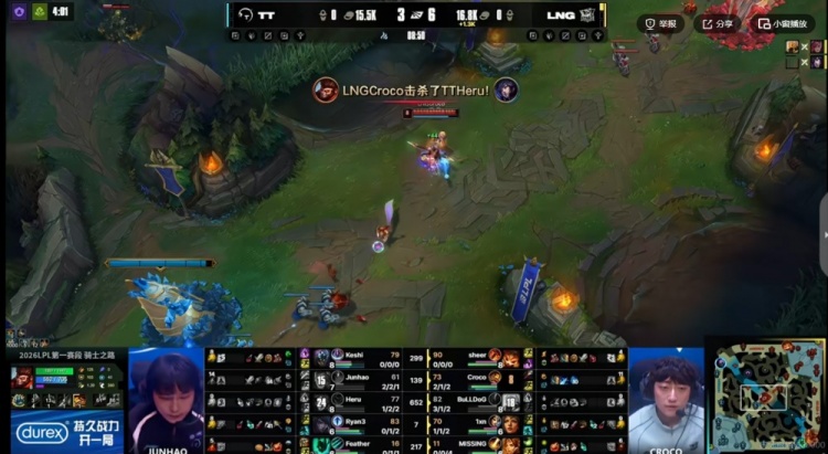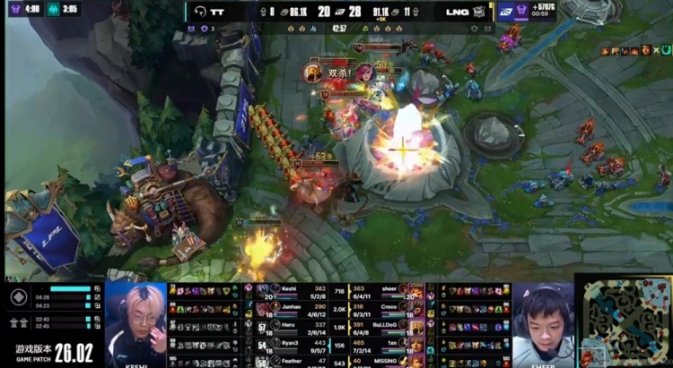 【29:16】TT拿下听牌龙!随后Croco猴子不走被开,Feather锤石被LNG反手强杀,Croco猴子转大开三个,但是Ryan3在后排输出拉满!sheer大纳尔跳人群直接吃到魅惑根本没打出控制啊!残局Ryan3厄斐琉斯三杀收尾,TT击杀LNG四人再拿二大龙!经济领先了!