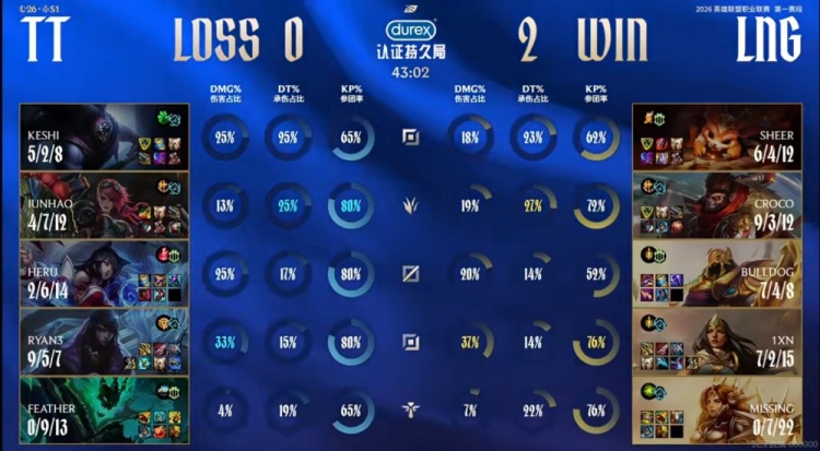 第二局比赛Croco猴子河蟹团抢6级帮助LNG拿下团战胜利,LNG早早拿下经济优势,中期一度领先5K经济!但是MISSING曙光和sheer纳尔连续给到机会,TT连拿两条大龙一度逆转了局势!但是Feather锤石关键时候被抓,LNG强行将比赛拖入到了七龙珠的局面!几波关键团Keshi贾克斯尽力给控制,帮助Ryan3厄斐琉斯拉满输出收割,TT一度看到了获胜的曙光!LNG这边1xn希维尔也在后排伤害拉满,Croco猴子几次关键控制留人+断蔚的Q也很关键!