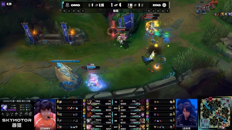 【24:42】中路团战,Hery兰博完美大招开烧,但Leave飞机反手轰掉re0,xiaohao皇子EQ反手挑飞OMG双C击杀Starry艾希,EDG打出3换4推掉OMG中路一塔,经济落后1.8k。