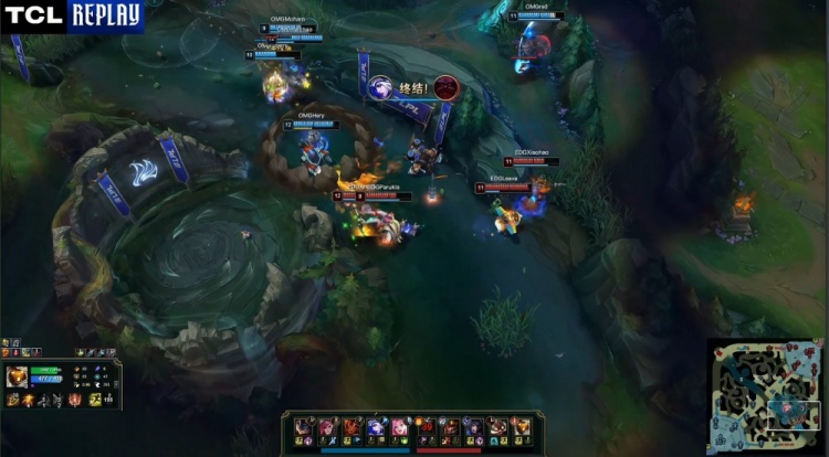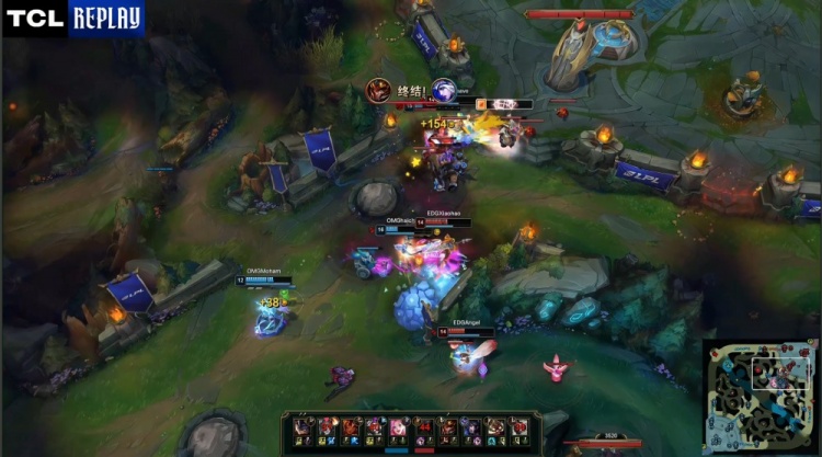 【36:16】EDG搏命开大龙,OMG姗姗来迟,但re0抢掉大龙,angel狐狸被hery兰博烤掉,Zdz奥恩也被Starry击杀,OMG轻松1换2,一波推平EDG基地拿到赛点。