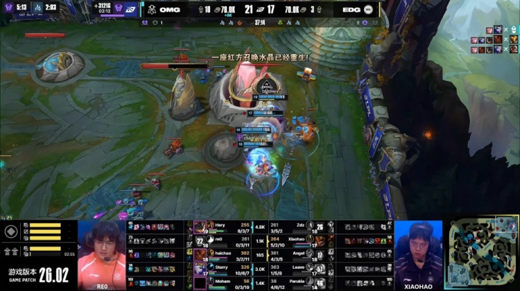 中期大龙团,OMG击杀Zdz奥恩与Xiaohao皇子,拿到大龙并取得3k领先。后续Starry艾希与Haichao岩雀连续击杀EDG关键人员,OMG推掉EDG两路水晶,最终re0蔚抢下大龙,OMG推平EDG基地拿到赛点。