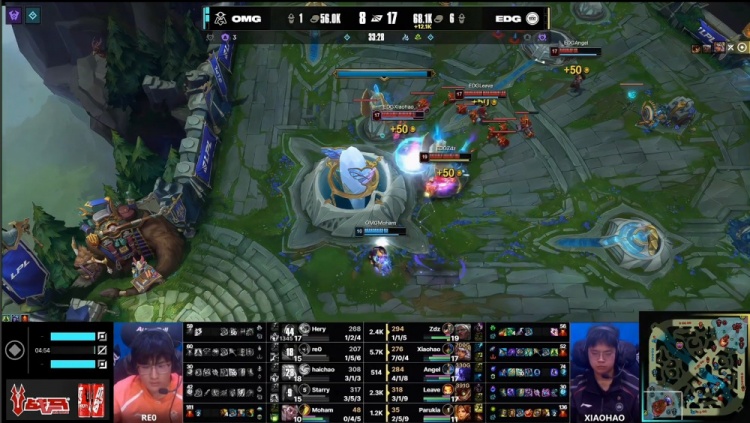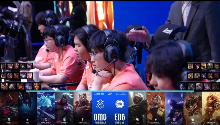 中后期OMG在大龙团击杀Angel瑞兹止血,紧接着Zdz安蓓萨绕后与Angel瑞兹反打,EDG打出0换3并拿下大龙,经济领先7k。最终龙魂团EDG团灭OMG,re0研发i5,EDG一波推平OMG基地扳回一城。