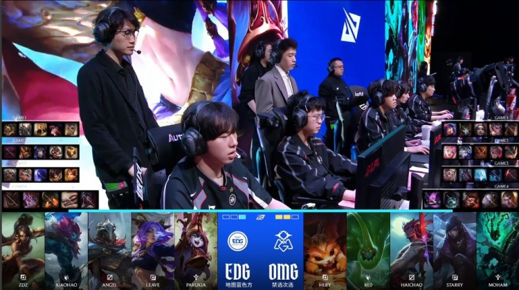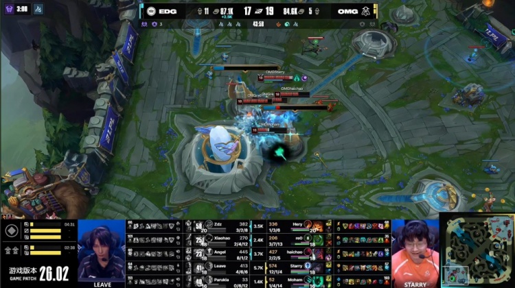 第四局前期Xiaohao巨魔连续入侵OMG野区,抢下双BUFF并配合Zdz豹女越塔击杀Hery纳尔,EDG拿到优势开局,经济领先来到2k以上。随后下路多次交锋,Starry厄斐琉斯连续击杀Leave芸阿娜,OMG将经济劣势缩小至1k。