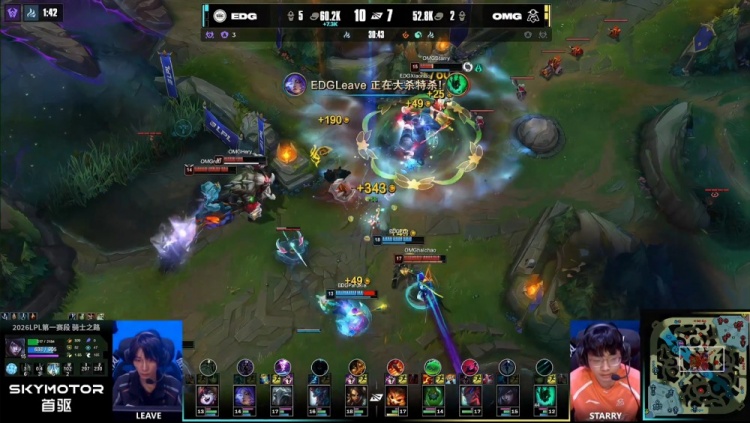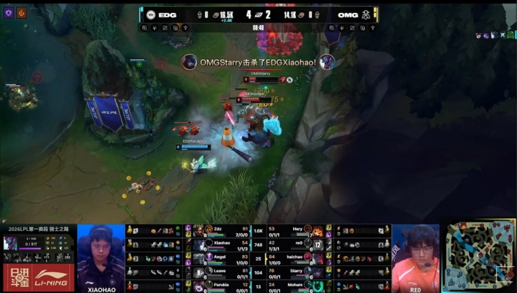 【13:10】下路re0继续开跳,Starry厄斐琉斯瞬间双杀EDG下路双人组拿到双杀,战绩来到4-0,OMG打出0换2,经济劣势回到1k。