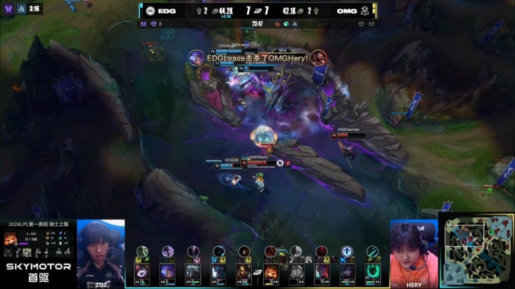 【39:01】中路交换技能,Starry厄斐琉斯闪现向前大招打空,河道继续切磋,EDG开三代大龙,haichao下路清兵TP正面,EDG中路反包OMG,Moham锤石被立场定住遭融化,EDG回头拿到大龙,经济领先8k。