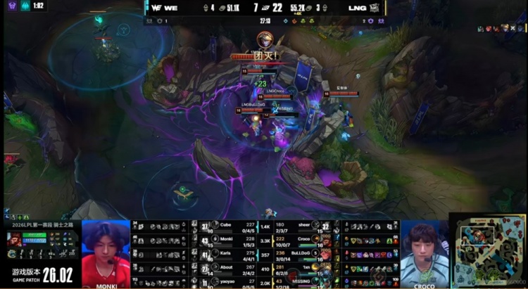 【21:38】Monki塞拉斯中路交E直接偷了个卡尔玛大招?回头自己被强开走不掉啊!LNG拿下龙魂!正面WE强开结果是About希维尔和sheer凯南互换,第二波是1xn伊泽瑞尔被强杀,但是打完龙的Croco猴子回到战场,配合BuLLDoG佐伊睡眠气泡留人成功!这波LNG相当于打出1+4的团灭!Croco猴子双杀,但双方经济差不到3K!