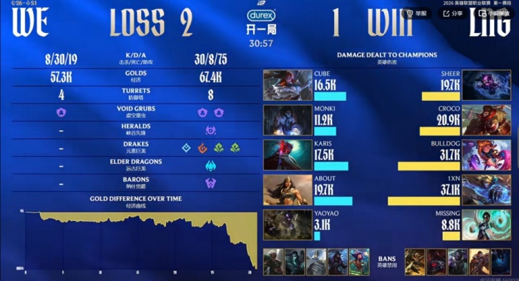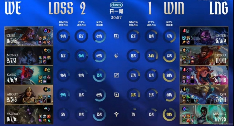 【30:32】多打少的LNG准备直接一波,少人的WE面对BuLLDoG佐伊的睡眠气泡守不住了!LNG这局终于没给机会,结束比赛,先扳回了一分!